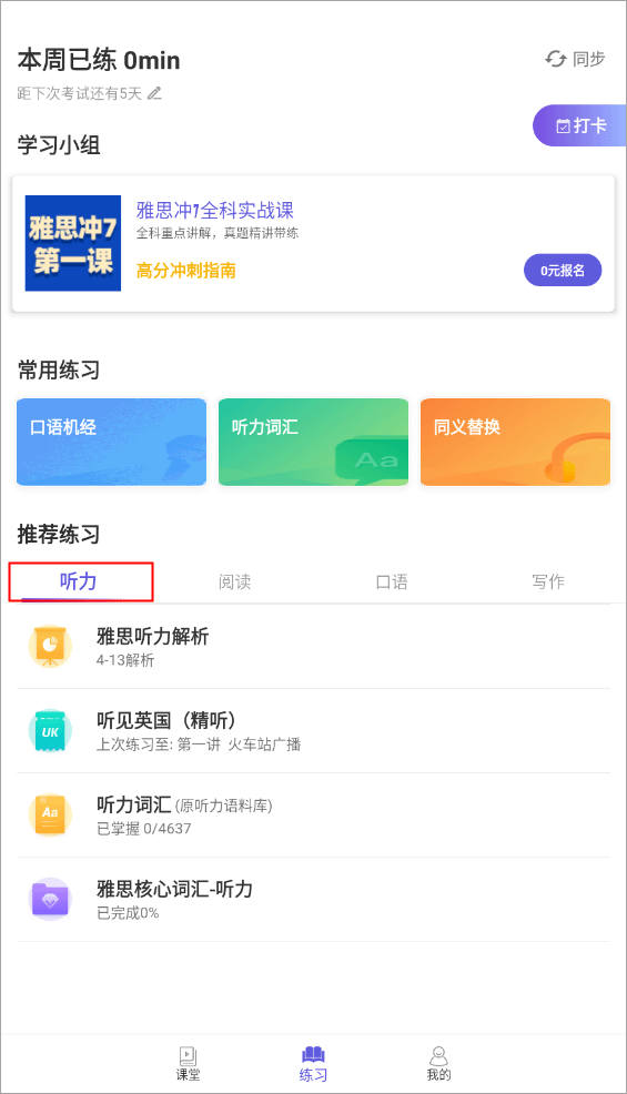 1进入软件后,依旧处于练习界面,在页面下方能够看到一个“推荐练习”板块,在听力板块里可看到有雅思听力解析、听见英国、听力词汇、亚次核心词汇 - 听力。