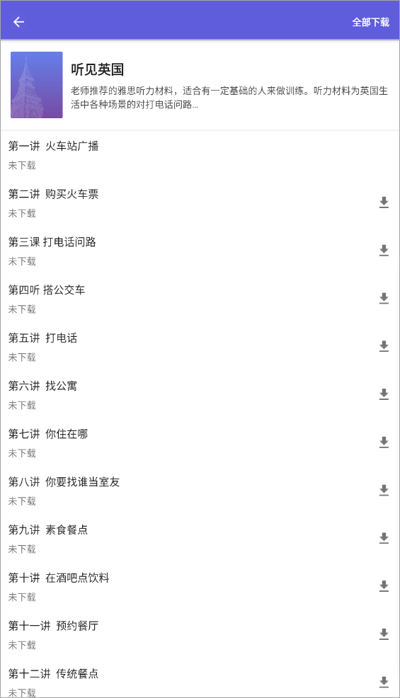 2、选择“听见英国-精听”并点击即可进入到听力资料下载界面,下载好之后点击课程即可进行精听。