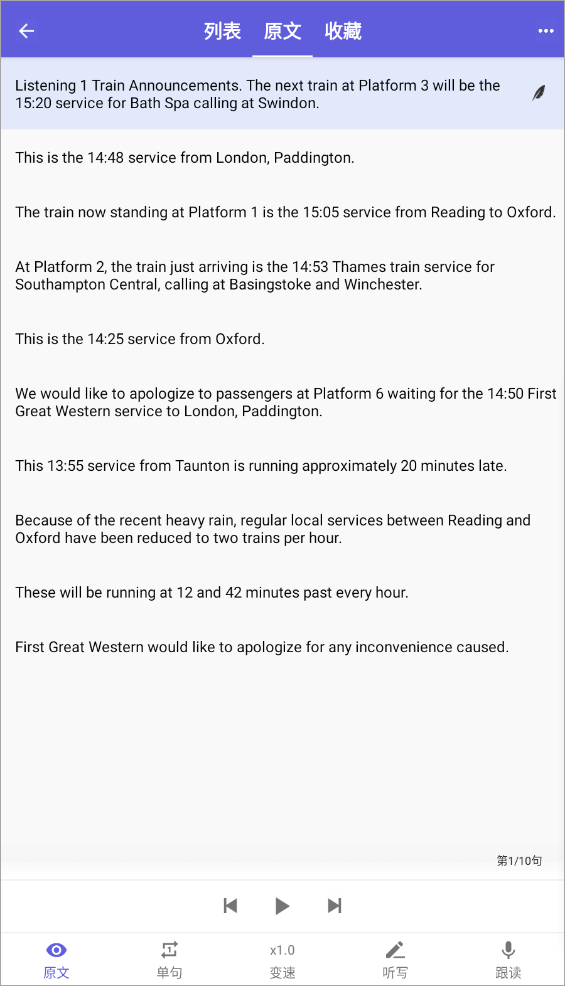 3、在听力界面,你可依据个人习惯,在下方操作栏对听力资料执行速度调整、单句显示、听写及跟读等操作,助力你更高效地开展听力练习。