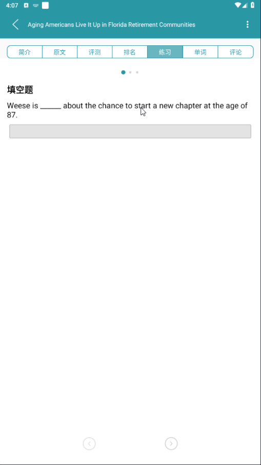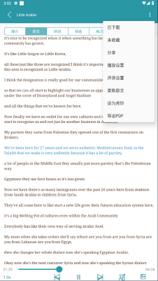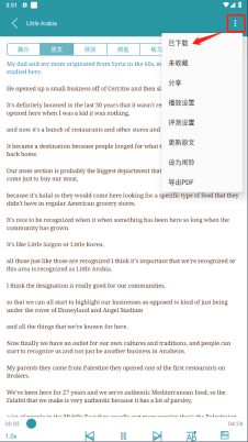 4、进入到此文章界面,大家可以在其中查看简介、原文和测评等内容,你还可以点击右上角的设置选项,进行播放设置、测评设置、更新原文、设为闹铃或导出PDF操作,如下图所示: