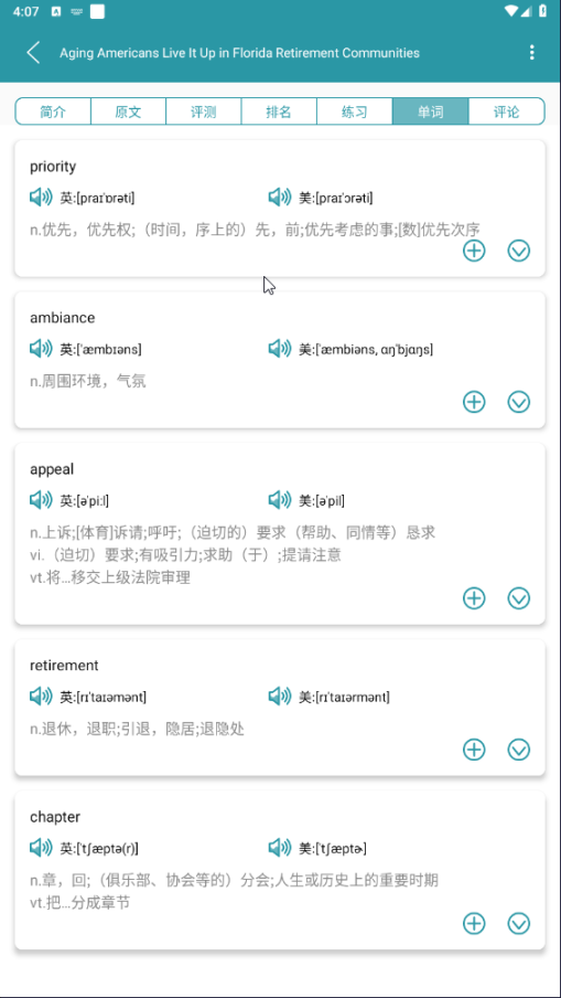 5、单词是英语学习的关键,对于不认识的单词,可以在听读的同时选词查看释义,可以听发音,并能添加到云生词本,走到哪里学到哪里,充分利用碎片时间!
