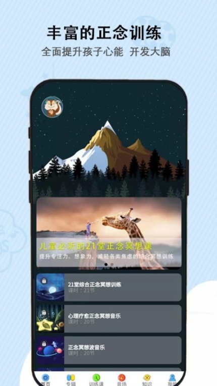 1、【正念训练】:涵盖21堂综合正念训练,还有专注力正念训练、学习力正念训练、影像引导式正念训练、情绪管理正念训练、减压正念训练、自信心正念训练、古诗正念训练、感像能力正念训练等多种类型。这些训练旨在提升孩子的专注力、学习力、自信心以及情绪管理能力等。并且,后续还会不断开发更多的正念训练内容。
