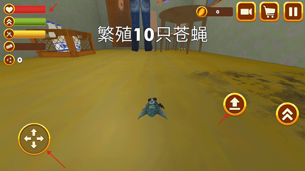 3、进入游戏后,屏幕左上方显示的是苍蝇的能量值,左下方为方向键,而右边红色箭头所指之处是飞行功能。