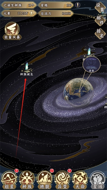 1、进入游戏,点击“种族诞生”发展祖星提升战力,种族越多,祖星战力越高。