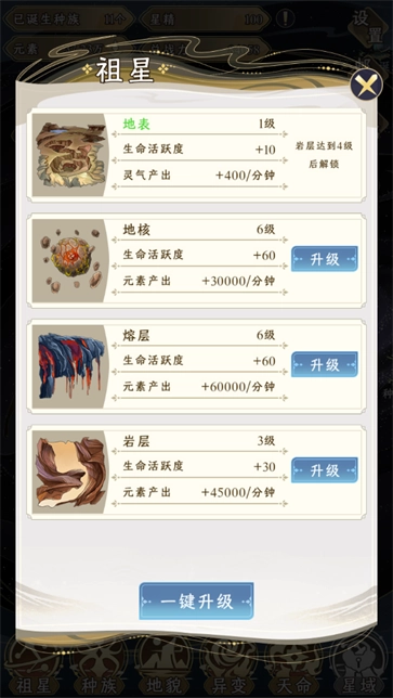 2、对祖星进行升级,能够提升生命活跃度并增加元素产出,进而催生出更多的种族。
