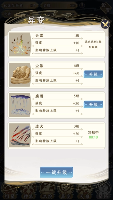 4、对“异变”进行升级能够提升种族上限,异变的程度越高,所能诞生的种族种类也就越多。