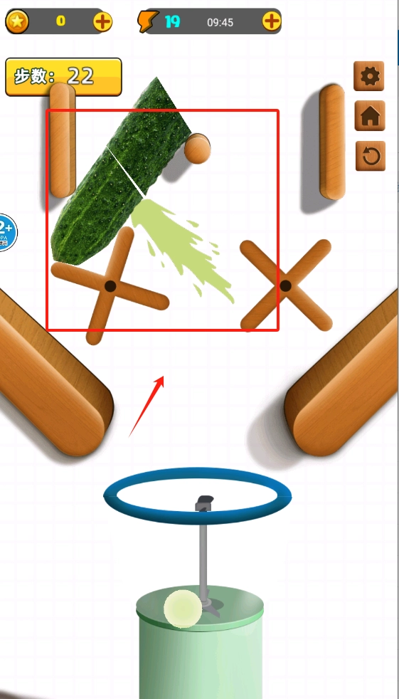 2、看,红框框住的黄瓜、木块以及带环装置,此时步数显示为22,留意对相关元素的操作 。