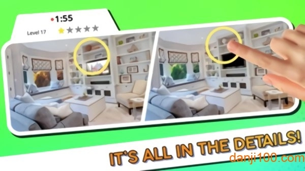 这款游戏画面极为简洁,纯色背景能助你在两张极为相似的图片里快速找出不同之处。用于找茬的图片皆为高清画质的照片,对眼睛伤害不大,你在游玩过程中还能适当放松,玩累了可随时暂停舒缓眼睛。而且每个关卡都呈现出一幅精美的图画,为玩家带来极致的视觉享受。整体而言,该游戏可玩性极高。