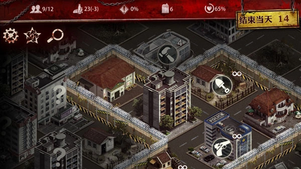 5、一开始,安排两个武力较强的人守着警察局,再派一人进入农场,其余的人一起去招募人员,一次不行就两次。此时留意围栏边是否有感叹号,若有,所有人都进入警察局;若没有,就去清理僵尸。要以最快速度将其中一人的武力值提升到最大。前期只需留意搜索食物,基本不会缺粮。等有了第一个武力值最高的人,将他调入警察局,再让除武力值最高者之外的人出来,开始清理僵尸、搜索食物、招募人员。你会发现,这个人的武力、劳动力、领导力增长得特别快。等你拥有10个人的时候,就要留意主界面上的危险度。前期大多时候需要所有人都进入警察局,这时你要大力探索,搜索人员,建立别墅,人越多越好。注意主界面上食物旁边的括号一定要是加号,若不是,就安排一个人专门生产食物。然后抢占研究所,研究各种增加食物的方法等等。剩下的就是一些人员安排,食物增加10左右即可,危险度控制在10以下,幸福度保持在50以上,我一般都能达到100。