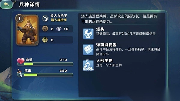 1、矮人的4种兵,机甲最肉前排,没有之一,火枪爆头,打boss神器,克制蝎子和骑兵,火箭兵群伤,克制剑士。矮子后排多,在火枪和火箭的光芒下,坦克反而显得可有可无。少一种兵?扳手?有人用吗?