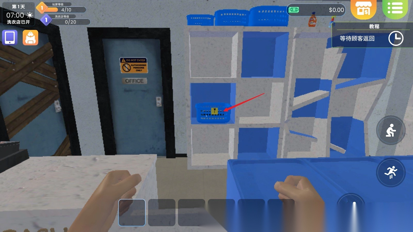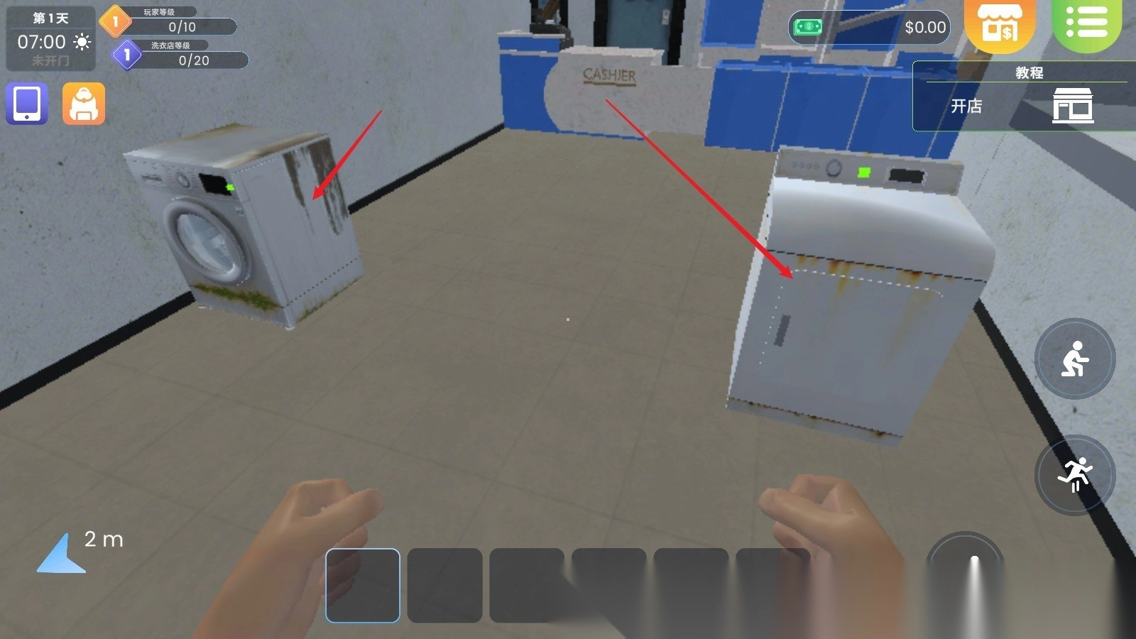 1.进入游戏后,首先会赠送你一台小型的洗衣机和烘干机,将它们摆放到店内。