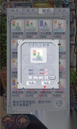 2)接着在集市里挑选【配方】,购入【迷烟情事】香水的配方。