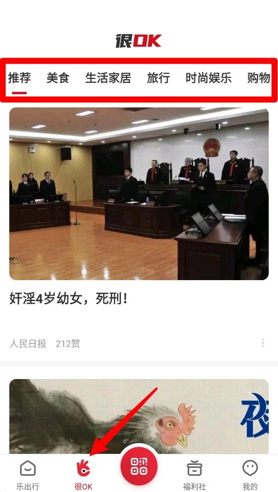 3、点击底部“很OK”进入资讯板块,可浏览推荐、美食、家居、旅行等本地热点及生活内容。