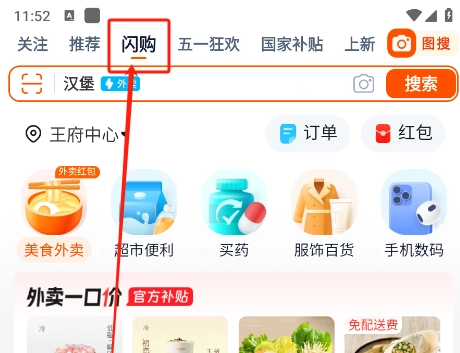 1、打开淘宝app,点击最上方的闪购页面,即可进入淘宝外卖界面