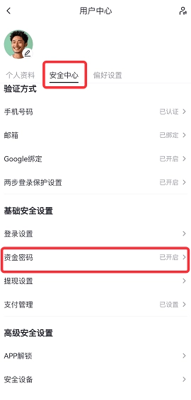 选择“安全中心” -> “资金密码”,进入资金密码修改界面。