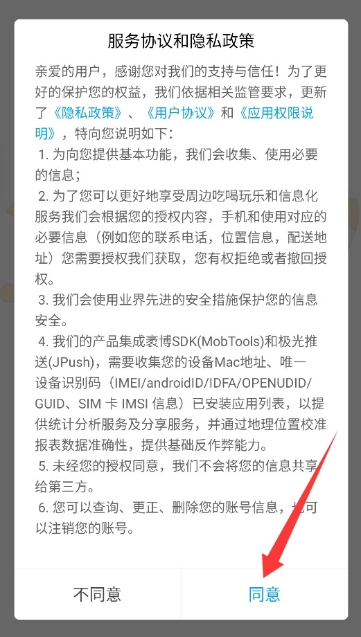 1、初次使用APP时,系统会显示用户协议与隐私政策,仔细阅读后点击同意并继续按钮进入。