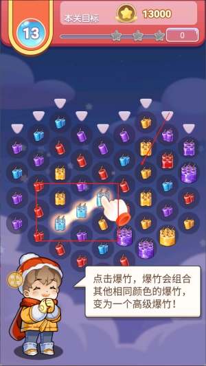 1、将三个或以上相同颜色的烟花依次连接,最后一枚会被点燃并爆破,清除该区域障碍物同时获得相应积分奖励。