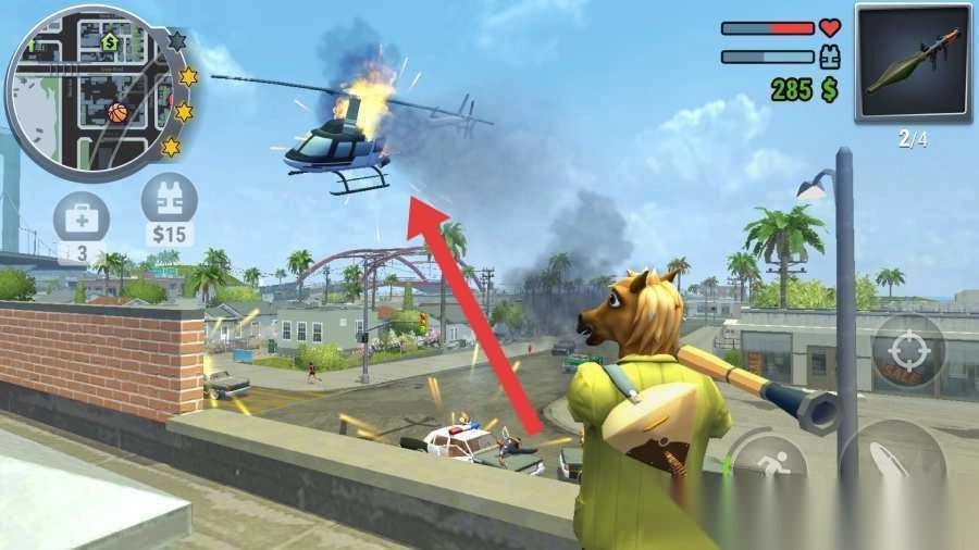 3、在屋顶战斗,操控马头角色,点击箭头指向的直升机,用火箭筒攻击,摧毁空中目标,完成高难度挑战。