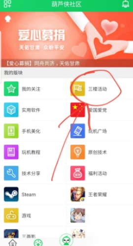 2、请首先打开葫芦侠应用,然后点击首页下方的“社区”按钮。