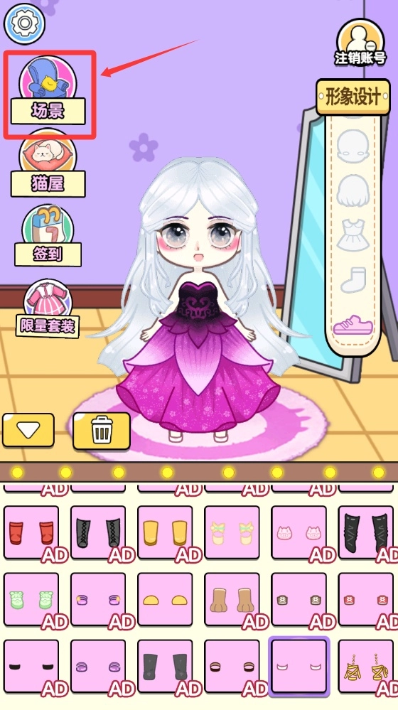 3、点击红色方框所标识的场景,在此场景中选择衣服、鞋子等物品。