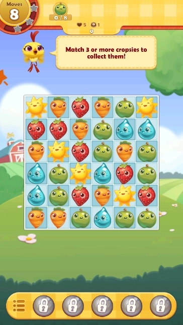 《农场英雄传奇》最新版(Farm Heroes Saga)是King公司开发的一款消除类游戏。大家想必对这家公司大名鼎鼎的《糖果粉碎传奇》不会陌生。与传统的以消除得分来通关的消除游戏不同,在《农场英雄传奇》里,玩家需要收集各种农作物才能顺利通关。