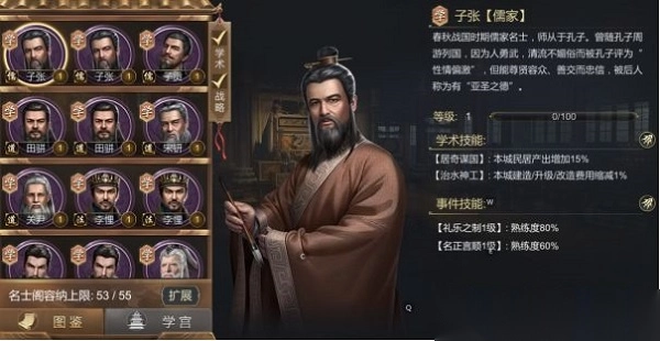主城有一处建筑名为稷下学宫,升级稷下学宫可以解锁更多的名士,名士在主城、以及分城任命会对本城有相应的效果。合理的任命名士可以增加增加资源产量(包括预备兵),减少征兵以及建造的资源消耗和时间,提升军队移动速度以及战斗力。