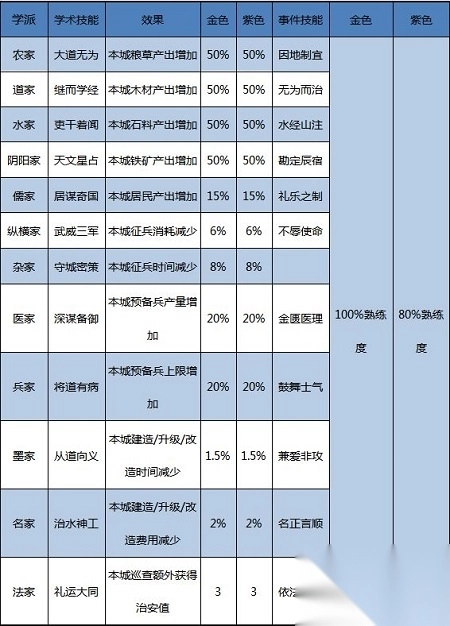 从查看的表格可知,各学派名士在学派技能方面的加成相同且为最高值。由于首个技能属于学派技能,那么第二个学术技能必然不属于本学派。实际上,若是金色名士,其第二个学术技能虽来自别的学派,但加成效果与该学派名士相同且为最高;而紫色名士的加成,仅约为该学派加成的75% 。