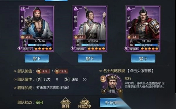 优先考虑上晋鄙,之后再看是否还需其他盾系武将。要是没有金将,紫将乐羊、朱亥、嫪毐等也能上阵。在略地或者PVP场景中,若对方有骑兵,那就可以派出戟兵中的田单。田单还能和盾兵进行混搭。前排步兵系武将优先学习援军秘策、叫阵,以此保护我方后排。骑兵系武将分类组合多样,有轻骑队、重骑队、游骑队,它们分别负责击杀敌方不同后排。而且骑兵队大多以冲阵为主,优先上阵樗里疾、公子虔,其主要作用是控制敌方后排,干扰对方输出。所有远程单位一旦被近身,就无法攻击一定范围内的敌军。