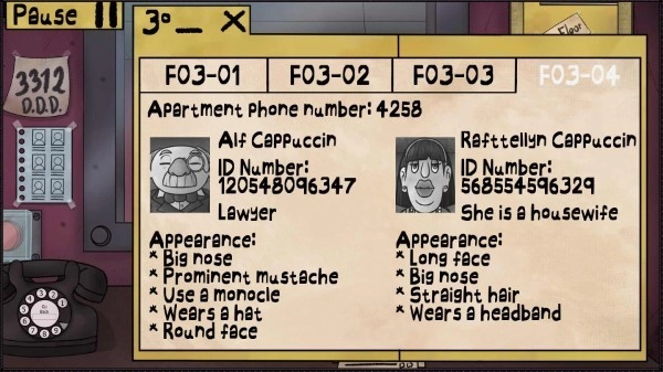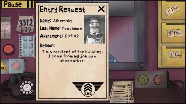 作为建筑物的看门人,玩家的角色由普通的门卫变成了保护租户的英雄,玩家必须阻止这些冒名顶替者进入的企图。玩家可以通过审查用户资料,检查身份证、确认公寓号码,甚至拨打验证电话来判断进入建筑的是人还是危险的生物