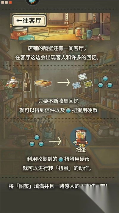 此外,在昭和杂货店物语2中除了经营店铺,玩家还能去往客厅收集扭蛋和金币,你能在扭蛋夕系统中会的更多新的收集,而这款游戏的主要核心就是收集图鉴,图鉴中收录着各种充满童年回忆的零食玩具等,动物饼干,摔炮,怪兽照片等等,随着玩家游戏的不断进行,最终你将体会完整的剧情和全部的回忆。
