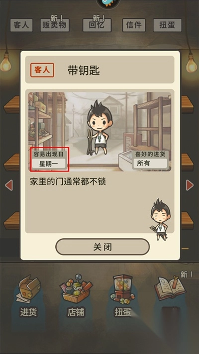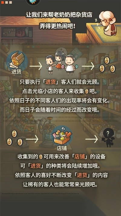1、进货:知道执行“进货”客人们就会光顾。点击光临小店的客人来收集金币,依照日子的不同客人们的出现率将会有变化,而日子会随着时间的经过而改变哦。