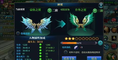 翅膀培养需要神羽材料,而培养到顶就需要进阶才可以进入阶段的培养,进阶需要的是灵魂之翼。而神羽和灵魂之翼这两种的材料都需要在商城购买,其他地方基本获取不了。