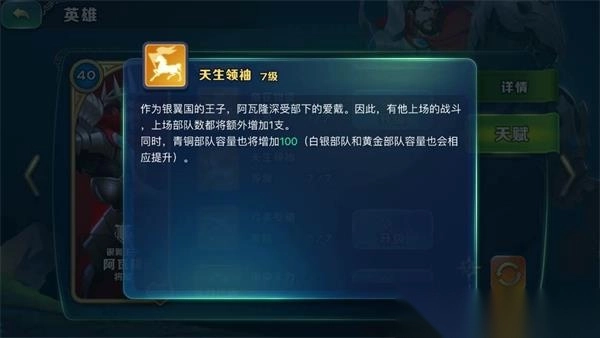 阿瓦隆,自带光环的骑士,能增加弓手的攻击力,“集中火力”打BOSS必备,最重要的是 “天生领袖”这个天赋,对于新手来说,这个天赋非常重要,能提高你上场部队的数量,以及提高你青铜部队、白银部队、黄金部队的容量,正所谓千金难买一人口,这个天赋一定要点,还有“缴纳物资”这个天赋,能在战斗后额外获取资源,在前期战力和体力有限的情况下,也是不错的选择,阿瓦隆看似辅助型英雄,但前中后期都有不同方向的高收益;