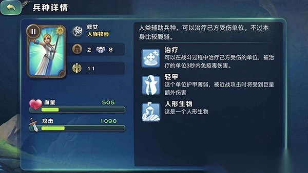1、人族是剑与家园目前版本中唯一有加血部队的种族:牧师。打开我们的大教堂查看牧师兵种的特性。