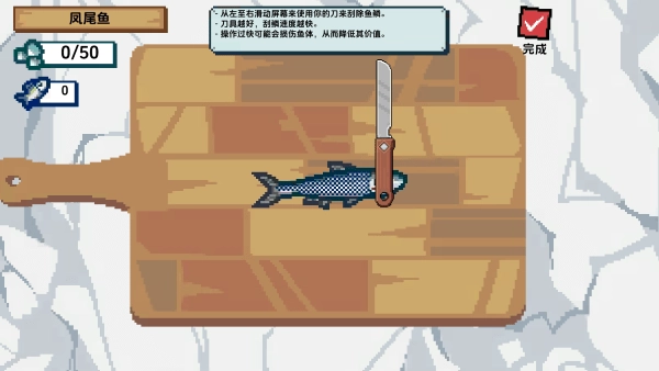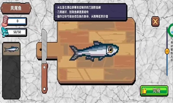 《小人和小船》正版游戏的整体操作玩法简单又有趣,核心玩法主要是刮鱼鳞。每次刮鱼鳞时都得小心谨慎,要是把刀具放在鱼背上,很可能会损坏鱼肉的品质呢!