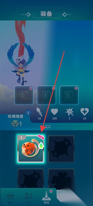 2、装备界面,点击带“NEW”标识的装备(如橙色宝石),进行穿戴或升级,提升角色属性与战力。