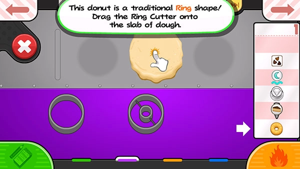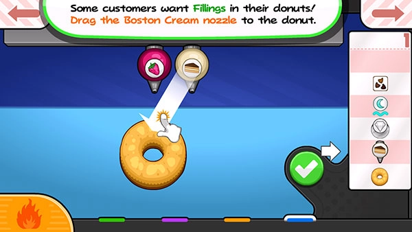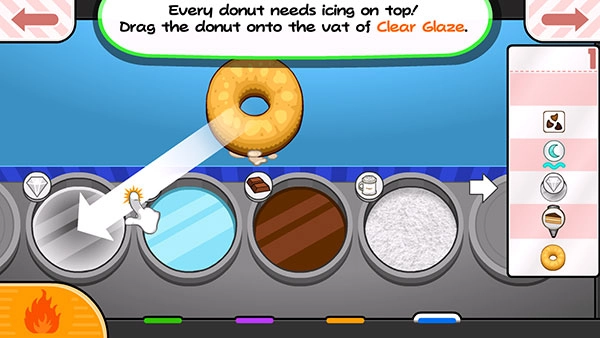 这一步相当关键,玩家的甜甜圈必须经过油炸才能出炉。具体油炸程度可通过炉子中的计量槽来判断,计量槽颜色越深,意味着甜甜圈颜色越趋近深色,也就表明甜甜圈越接近完成状态。特别要注意的是,甜甜圈有两面,务必两面都炸到,此外,千万记住不能炸太长时间。