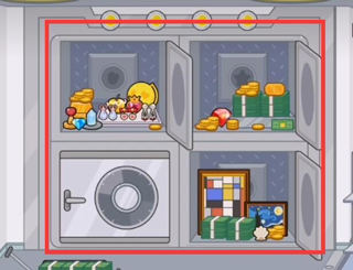 到达银行的二楼后,开启保险柜,按照图形提示找到钻石、红心、星星和贝壳,并依次放入,这样保险柜就会打开,里面藏有许多宝物。
