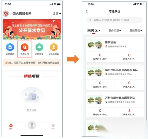 2. 在首页找到并点击【志愿队伍】,浏览目标地区的队伍或协会,随后点击加入。