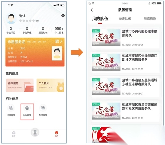 3、进入【我的】界面,点击【队伍管理】,即可查看自己加入过的队伍、处于待定状态的队伍以及脱离队伍的记录。