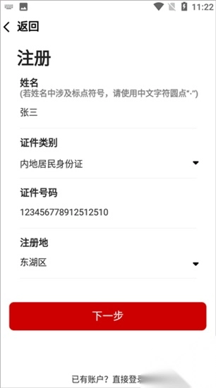 3、依据要求录入个人信息,点击“下一步”,完成注册。
