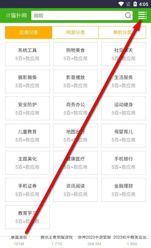 1、打开IT猫扑网app,就像在使用网页版那样,分为了首页、应用、网游、单机、专题等多个不同分类。
