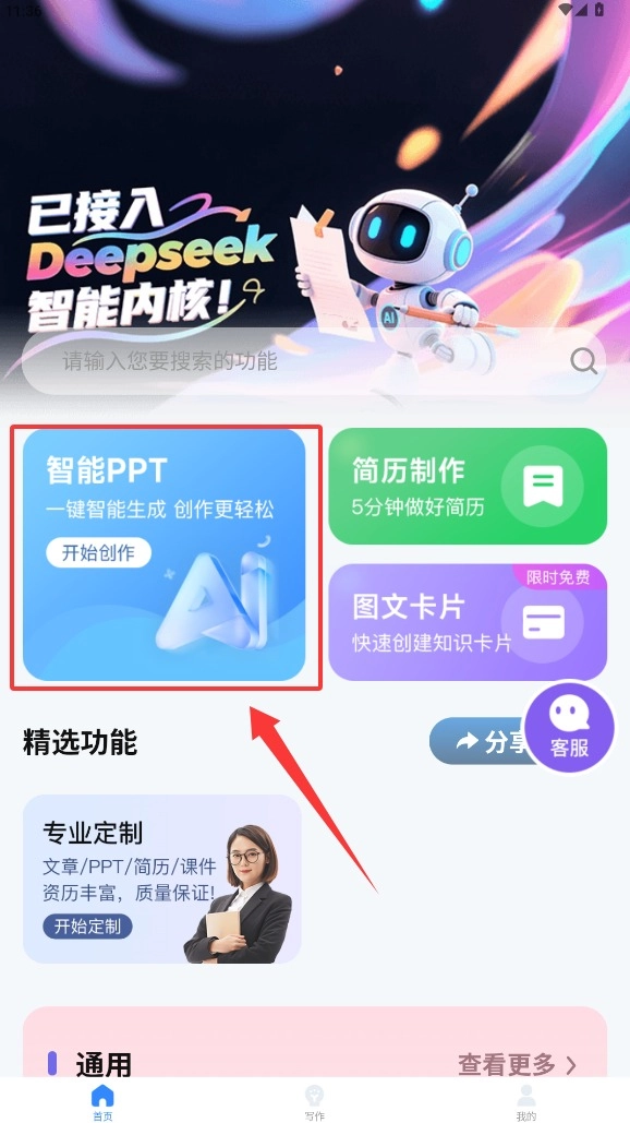 2. 当您进入主页面,在左下角找到“智能PPT”功能模块,接着点击“新建项目”按钮,便能打开创作界面。