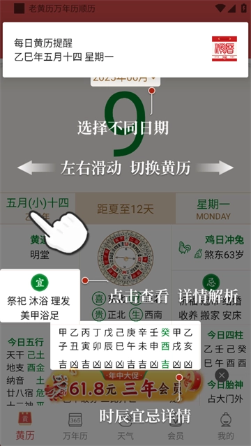 顺历老黄历万年历,是一款集日历与黄历查询功能于一体的实用日历工具。它涵盖农历、时辰、天气、宜忌等诸多功能,为用户全方位提供专业的黄历、万年历、黄历天气、节气养生、个人运势、日程提醒以及备忘记事等服务。这款顺历老黄历日历 app 精心采集传统日历通胜书中的内容,并巧妙结合现代科技,依据黄历宜忌与个性化算法,为用户精准推荐运势。别看它只是个小小的日历,内容可是相当丰富呢!