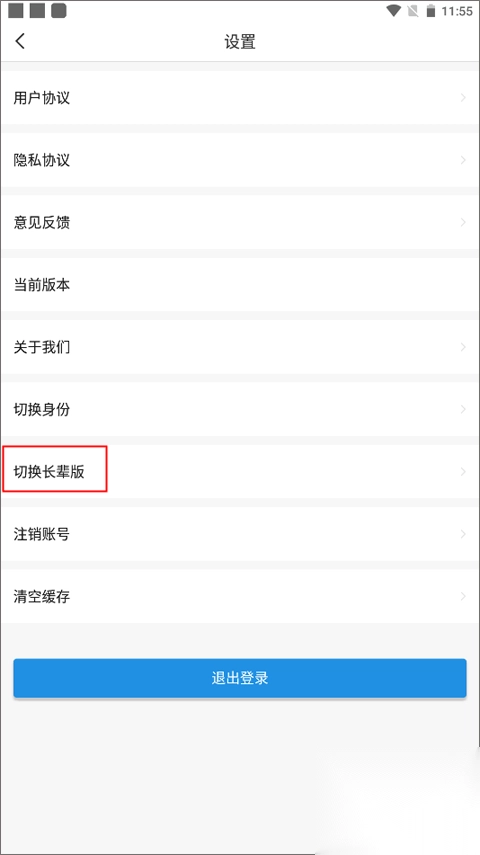 2、在设置界面中,你可以看到意见反馈、关于我们、切换身份等功能按键,点击“切换长辈版”;