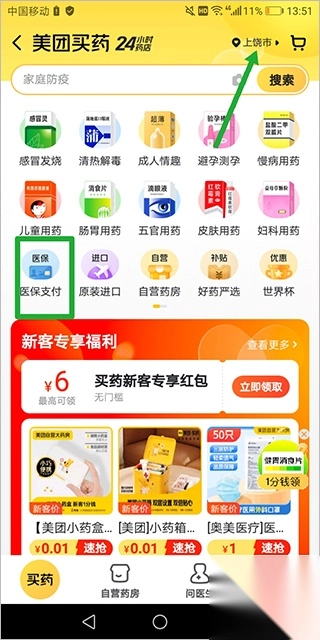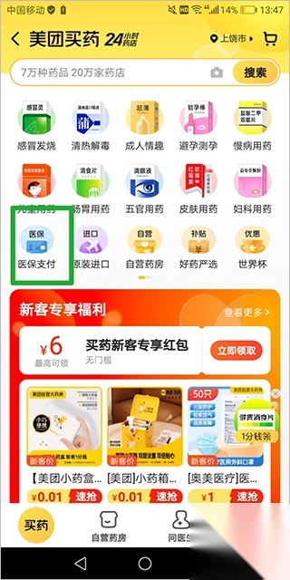 1、第一步,确认所在地区在美团买药app上是否开设了【医保支付】专栏,只有该功能已开通,才能使用医保支付。