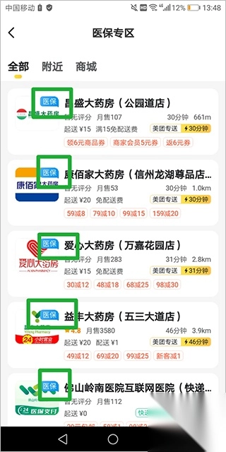 3、选择带有【医保】标识的药店(下图绿色方框区域)