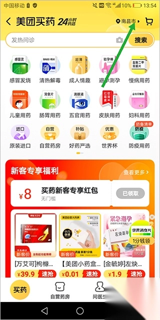 若用户所在城市未开通医保支付,便不会出现【医保支付】专栏。如下图所示,这是南昌市的页面(留意页面右上角绿色箭头所指的地区),此处没有【医保支付】专栏,意味着南昌市在美团买药平台上尚未开通医保支付方式。