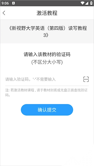 3、输入验证码进行激活。若验证码配备二维码也可扫码激活,U校园上激活教程所用验证码一般在教材封底粘贴,将验证码涂层区域刮开(轻刮,小心损坏验证码),即可看到验证码。
