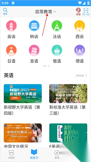 用户能够在“外研随身学”app(也就是U校园app学生版)的随身学页面里,点击顶部的校园版本切换区,具体位置如以下图片中红色箭头所指区域。